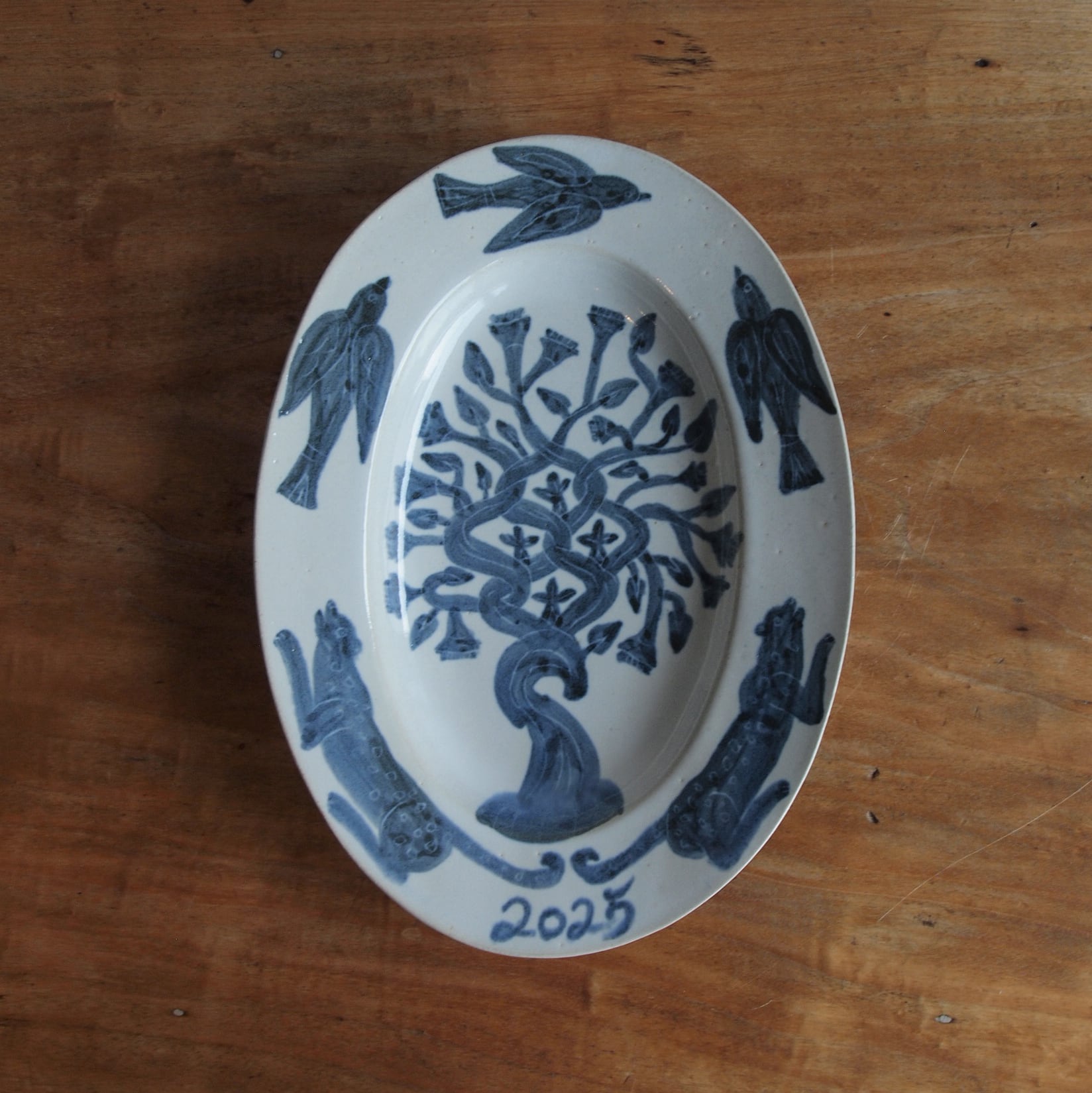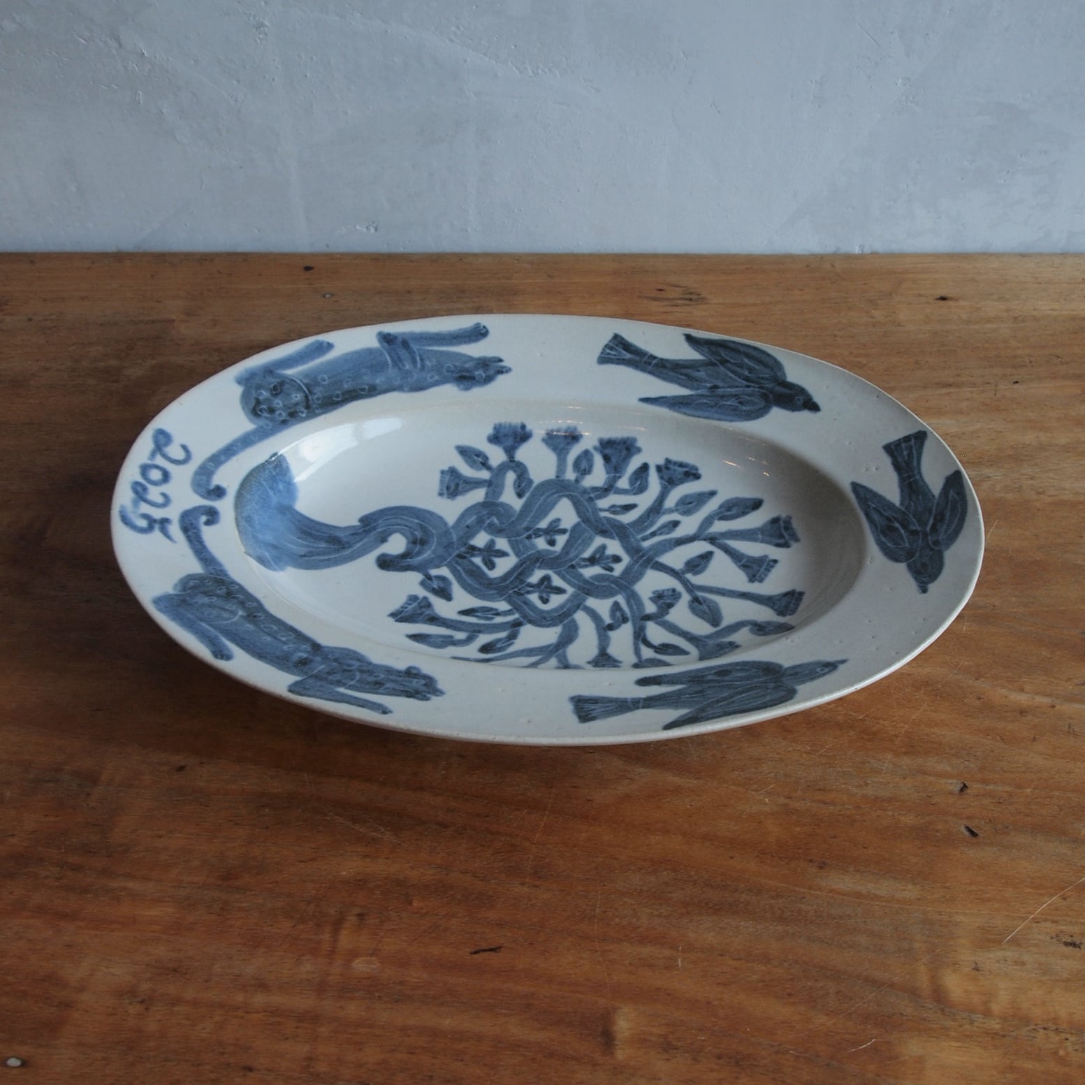 リムのあるオーバルのお皿に今井さんが絵付けしたとても素敵な絵皿です。