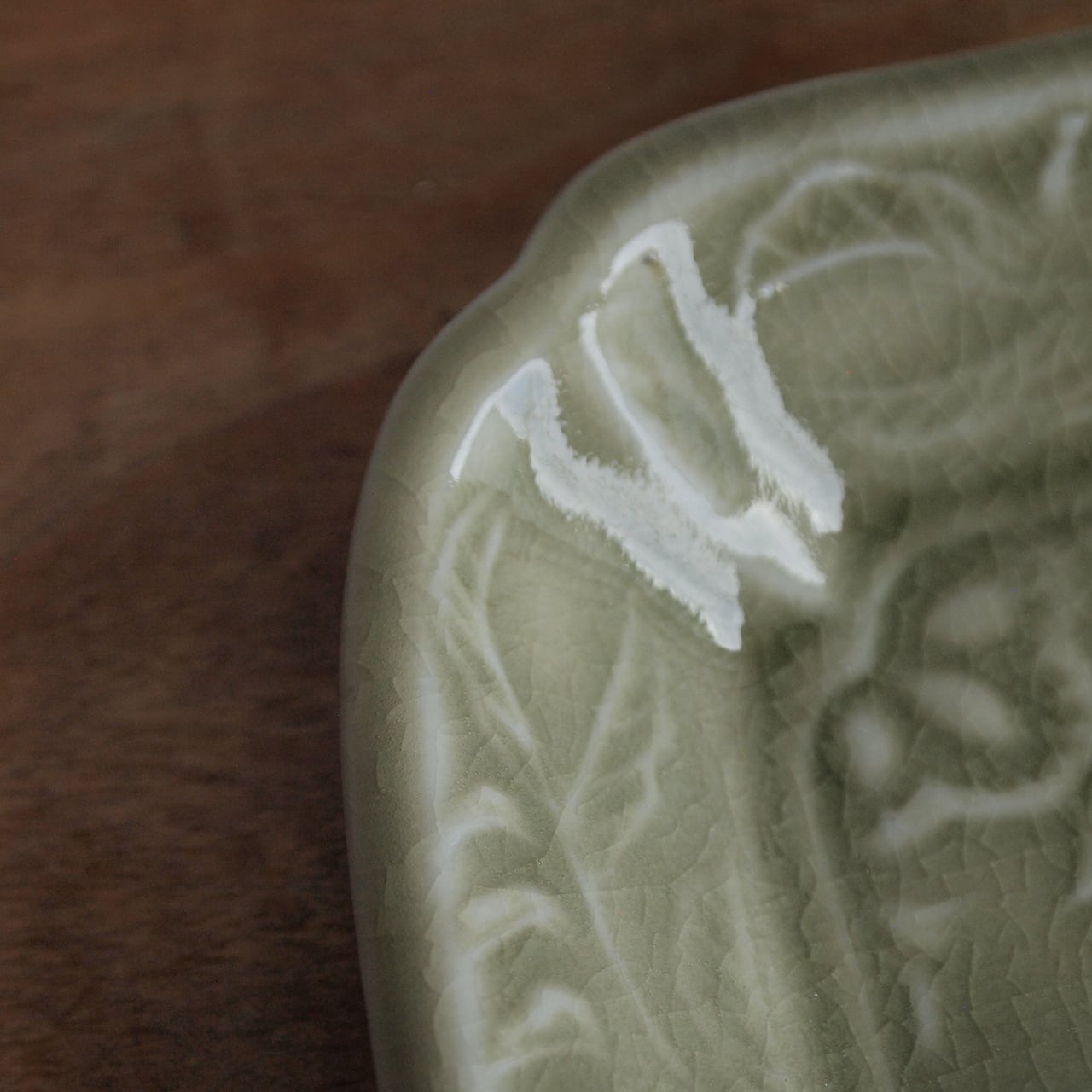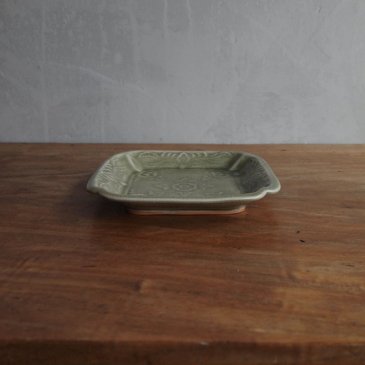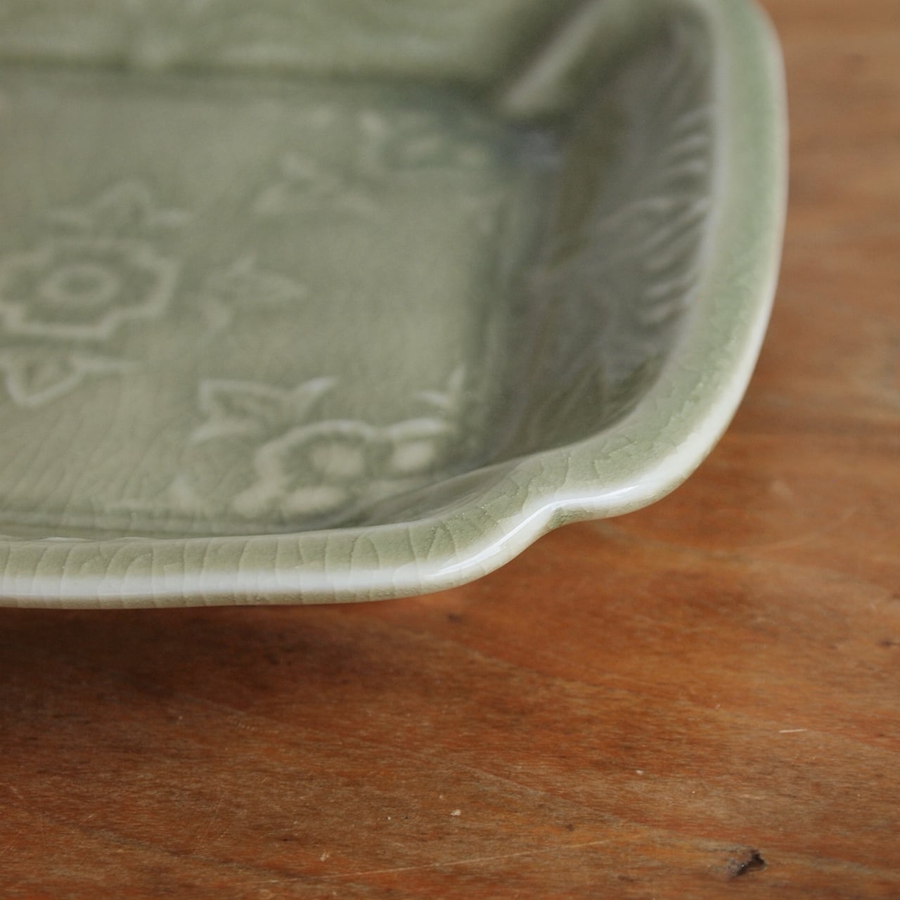 【online個展】稲村真耶|貫入青磁陽刻唐花隅切四方皿
