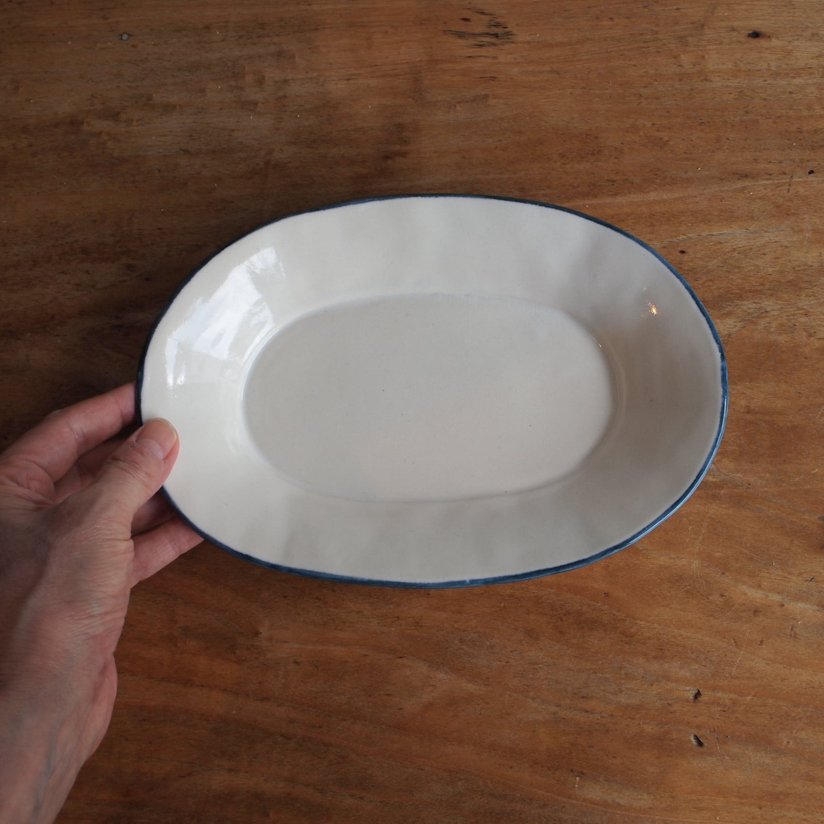 艶のある白のアンティークのようなお皿。青い縁取りが爽やかです。