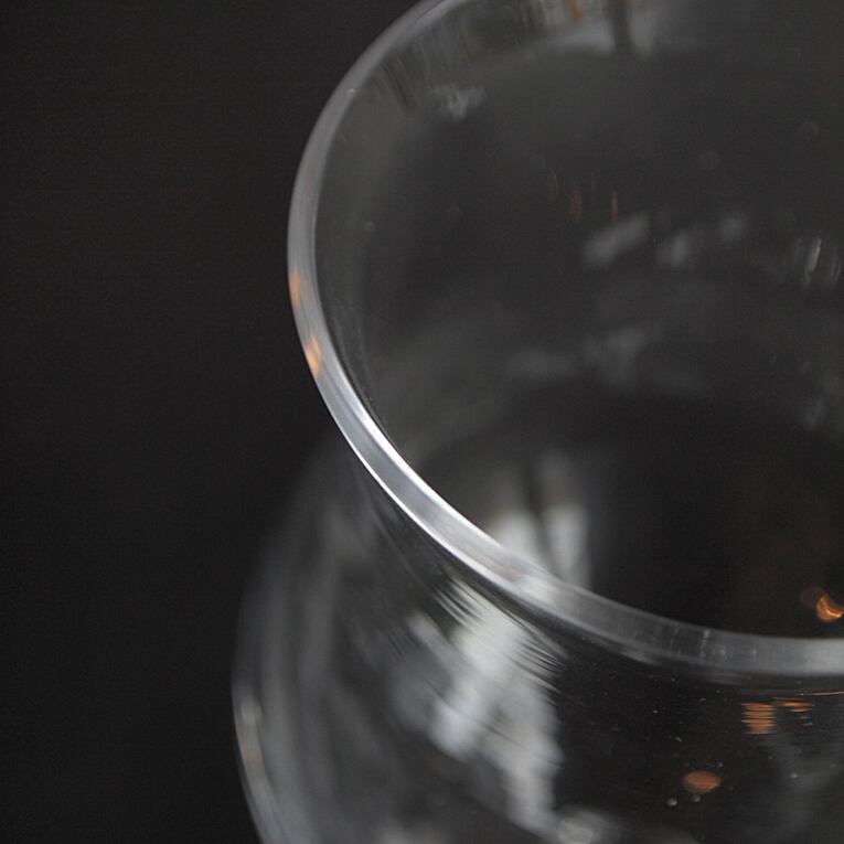 反った縁がエレガントなワイングラス。丸がふたつ付いたステムも長めですが細くないので安心感があります。